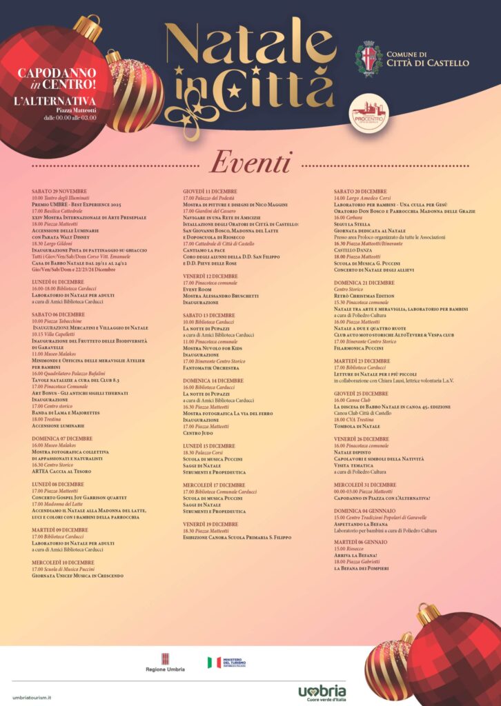 Dal 29 novembre 2025 fino all’Epifania, Città di Castello propone un ricco calendario di appuntamenti che coinvolgono residenti e visitatori, offrendo esperienze adatte a tutte le età: dai mercatini di Natale agli eventi musicali, dalle attività per bambini alle mostre d’arte, fino alla tradizione gastronomica umbra.