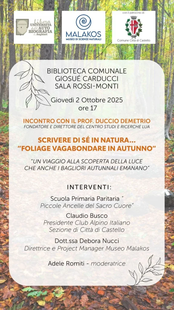 Giovedì 2 ottobre la città di Città di Castello ospiterà un evento imperdibile per chi ama la scrittura, la natura e la riflessione interiore: il professor Duccio Demetrio terrà un incontro dal titolo “Scrivere di sé in natura”.